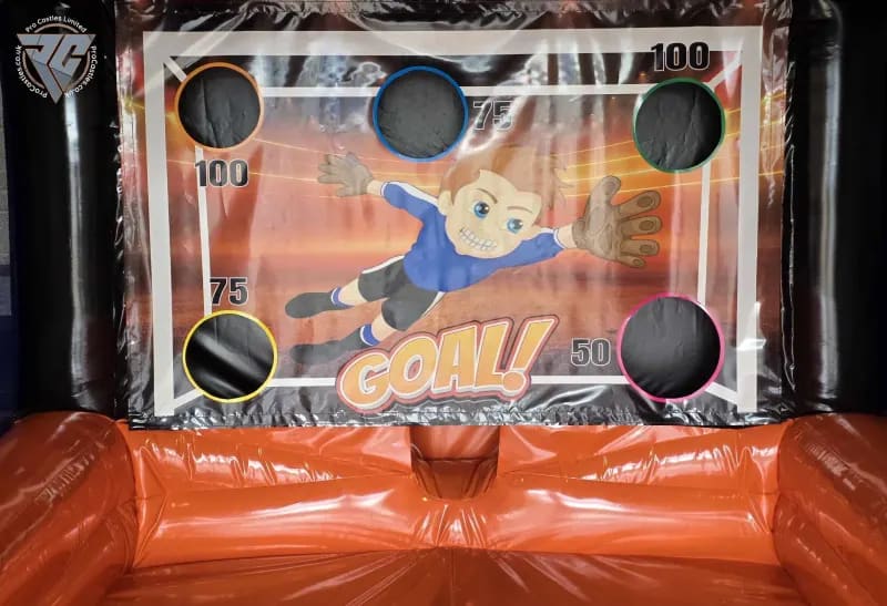 • Interactive Gameplay: Participants aim to score points by shooting footballs through designated holes at the back of the inflatable, testing their accuracy and skill.