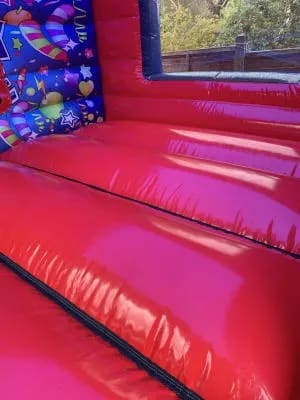 This bouncy castle is themed with colourful balloons, stars and ribbon and make for a perfect unisex castle for boys and girls birthday parties. Inside there is more digitally printed celebration artwork, bright red floor that reflects the disco light that also comes with the hire. there are three steps that lead up to the steep slide which has a glossy slip sheet to make for a fun ride down.. Currently pictured above in Gravesend, this is inflatable is suitable for both outdoor use for back garden parties or inside a venue for birthday parties.