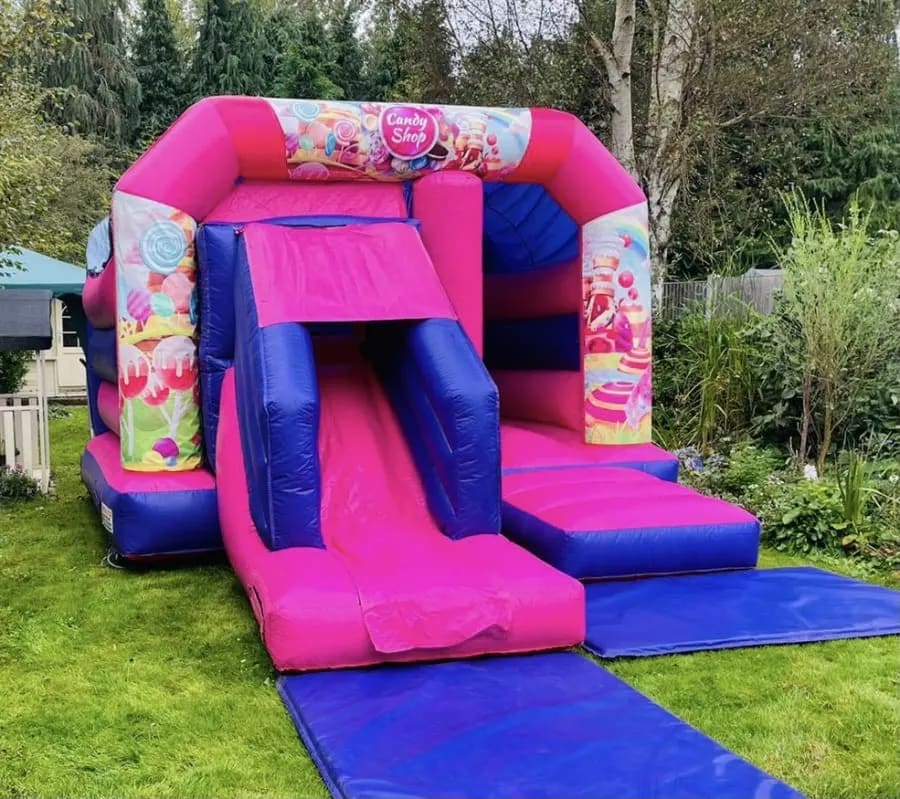 Book Your Candy-Themed Pink & Purple Bouncy Castle with Slide Today!