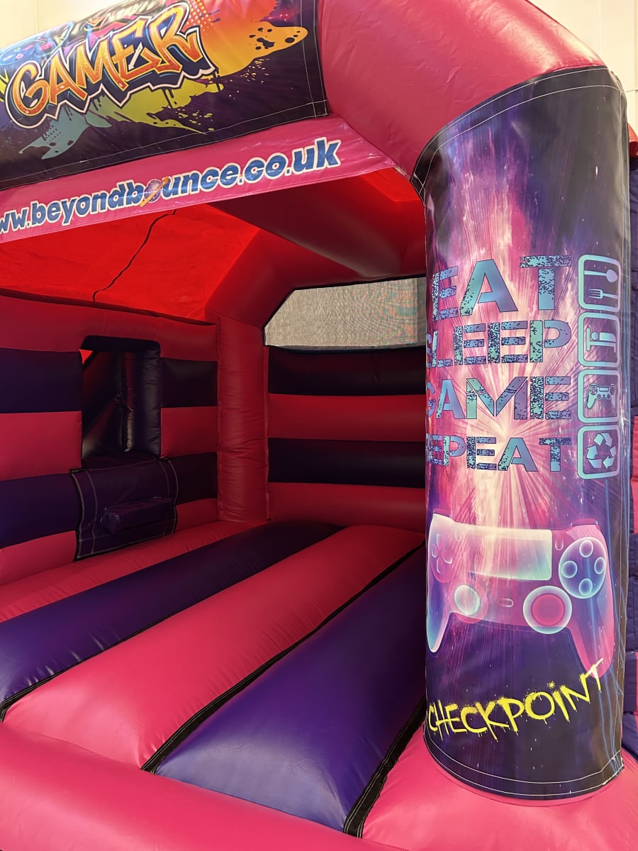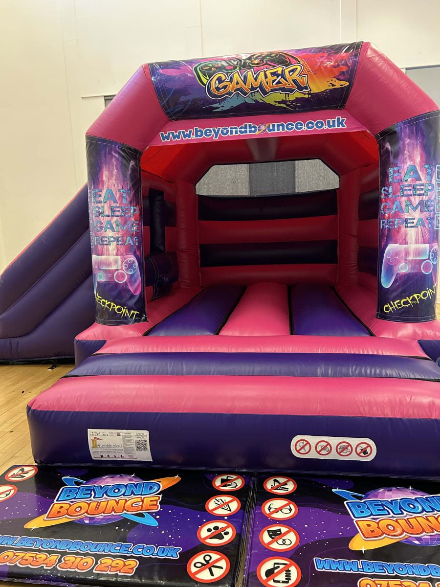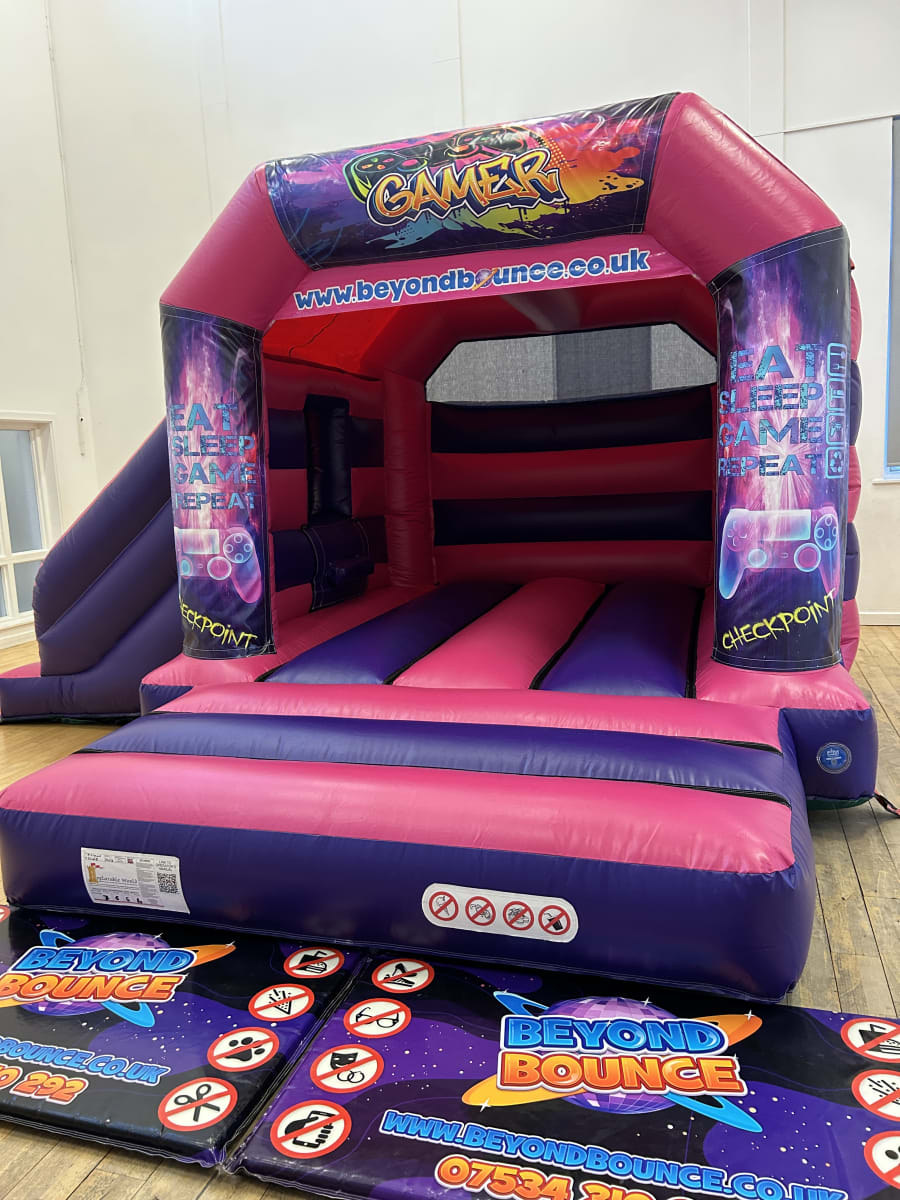 Our gaming bouncy castle hire is a brilliant choice for modern parties where gaming is part of everyday life. Finished in eye-catching pink and purple with a side slide, this inflatable brings together bouncing, sliding, and that familiar “eat, sleep, game, repeat” vibe that kids instantly recognise.