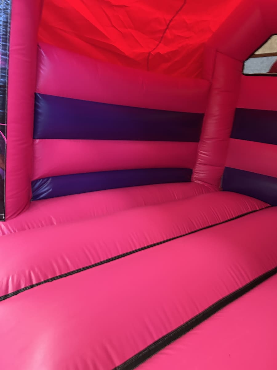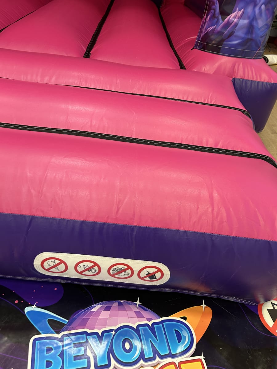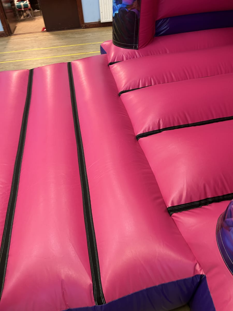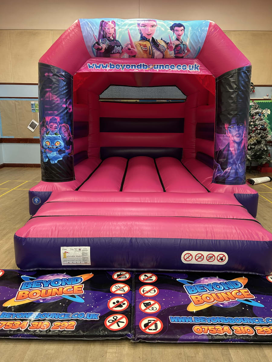 Recently, we shared news across our social channels about our brand-new Velcro bouncy castles, proudly manufactured in the UK by Inflatable World Leisure, one of the most respected names in the industry. The pink and purple bouncy castle pictured is part of this exciting new range, featuring bold Netflix-inspired Demon Hunters artwork securely attached using our Velcro system.