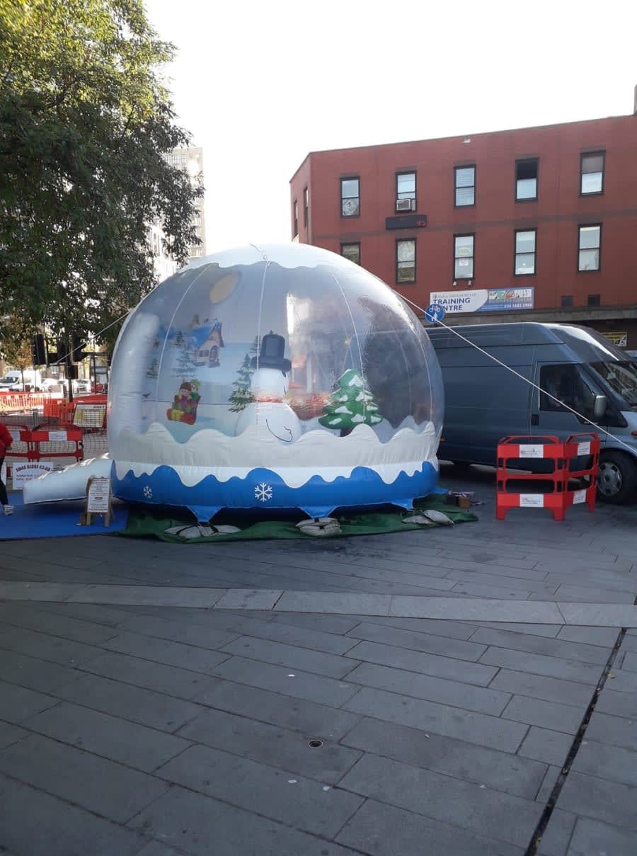 Schools, nurseries and corporate parties hire this giant-sized inflatable snow globe bouncy castle for all the family
