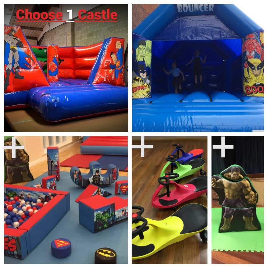 - Super Hero Castle: Our NEW superhero-themed bouncy castle, perfect for bouncing and superhero adventures.