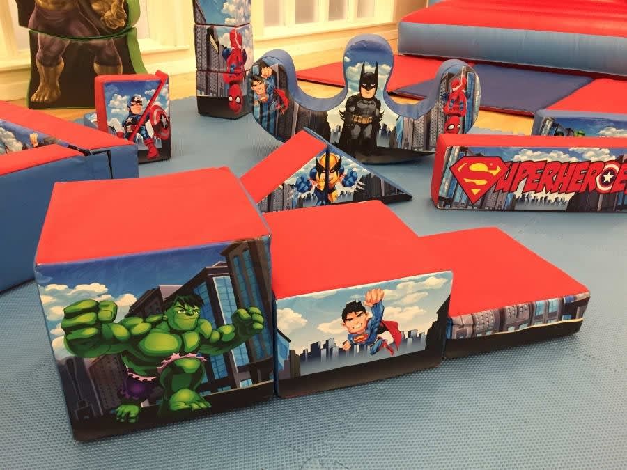 - Super Hero Soft Play: Includes an amazing soft play ball pool, 18 awesome superhero shapes, a slide, and a double rocker.